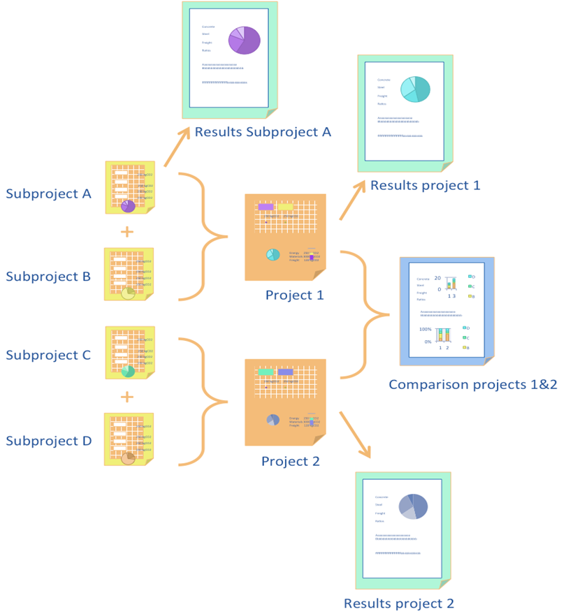 A great strength of the tool is that it will allow you to model different approaches to the same project. So if you want to explore the carbon emissions impact of using one type of technique, or material over another, the CO2 Calculator will allow a direct comparison. See workflow diagram below.